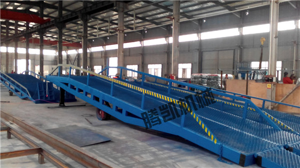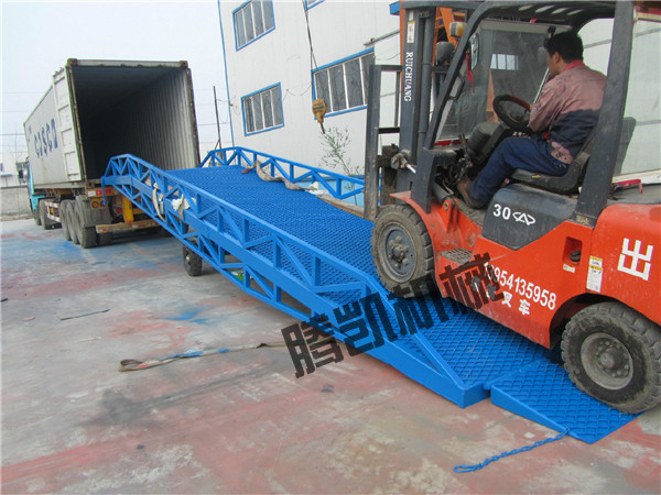 移动式登车桥是与叉车配合使用的货物装卸辅助设备,根据汽车车厢的高低调节高度,叉车可以直接通过本设备驶入车厢内部进行货物的批量装卸,仅需单人作业,即可实现货物的快速装卸。它使企业减少大量劳力,提高工作效率,获取更大经济效益。